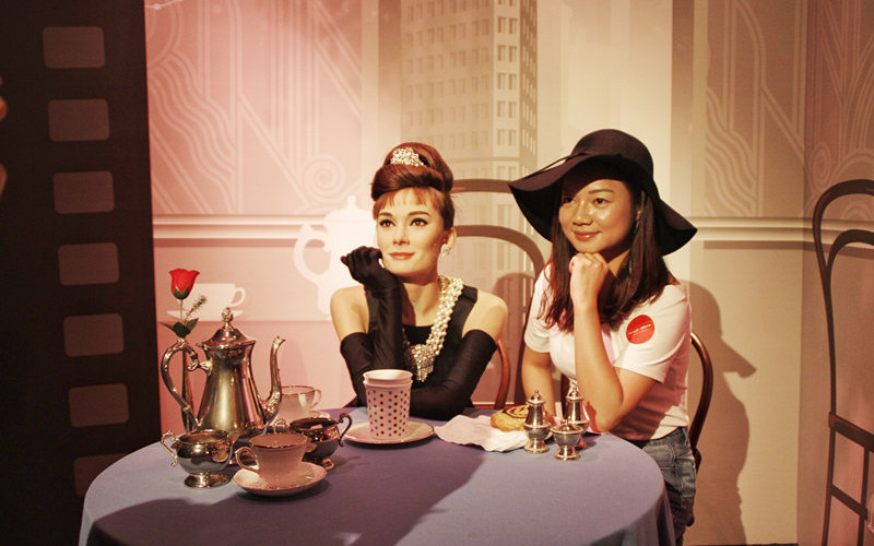 △ “環(huán)球影視”區(qū), 落入人間的天使“奧黛麗·赫本”穿著60年代最時尚優(yōu)雅的小黑裙享受著她的《蒂凡尼的早餐》,少女心萌動了~~