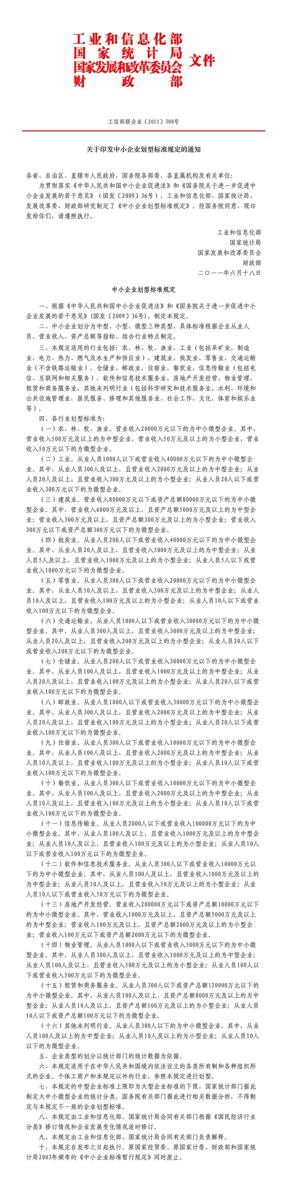 關于印發(fā)中小企業(yè)劃型標準規(guī)定的通知