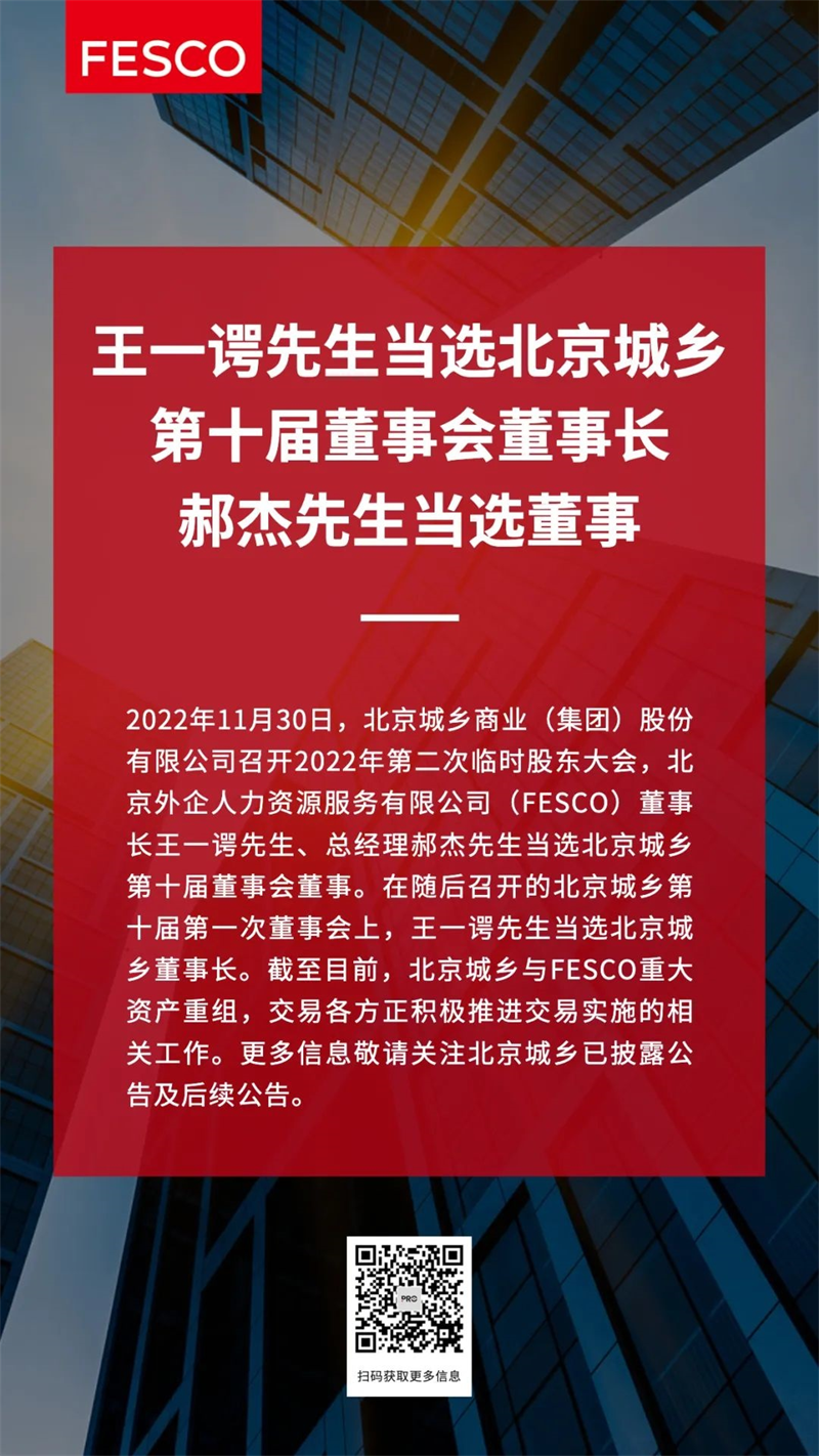 據(jù)2022年12月1日北京城鄉(xiāng)公告,在近日召開的2022年第二次臨時(shí)股東大會(huì)上,決議通過北京外企人力資源服務(wù)有限公司(FESCO)董事長(zhǎng)王一諤、總經(jīng)理郝杰為北京城鄉(xiāng)第十屆董事會(huì)董事。在隨后召開的第十屆第一次董事會(huì)上,王一諤全票當(dāng)選北京城鄉(xiāng)董事長(zhǎng)。
