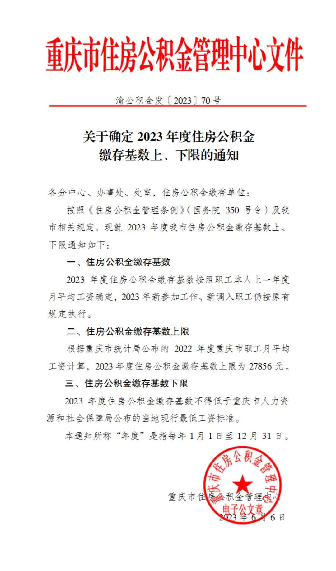 近日, 重慶市住房公積金管理中心發(fā)布《關于確定2023年度住房公積金繳存基數(shù)上、下限的通知》,文件主要內(nèi)容如下: