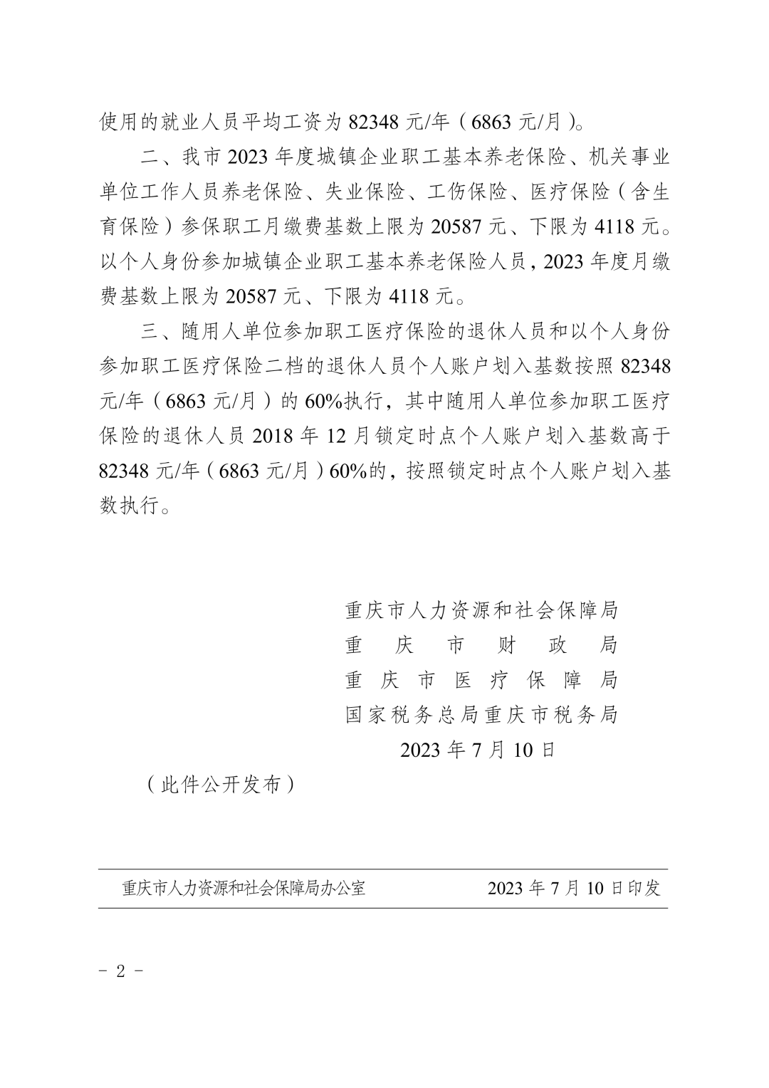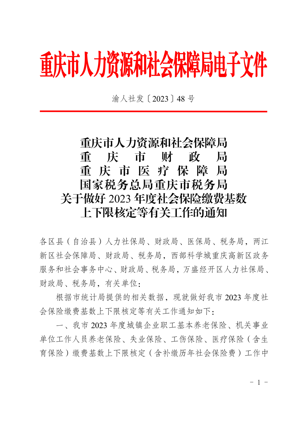 近日,渝人社發(fā)[2023]48號文件公布了2023年社會保險繳費基數(shù)上下限的通知,文件內(nèi)容如下: